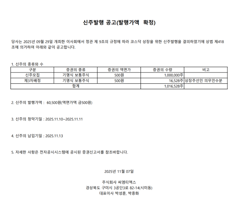 씨엠티엑스(CMTX)가 2025년 11월 기관투자자 수요예측을 마치고 공모가를 희망밴드 상단인 60,500원으로 확정했습니다. 기관 경쟁률은 756.19대 1, 의무보유확약 비율은 71.8%로 집계되며 2025년 하반기 IPO 시장에서 가장 높은 관심을 받은 종목 중 하나로 자리 잡았습니다.